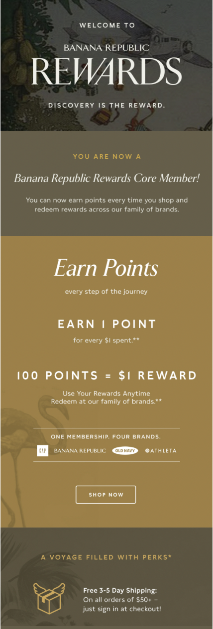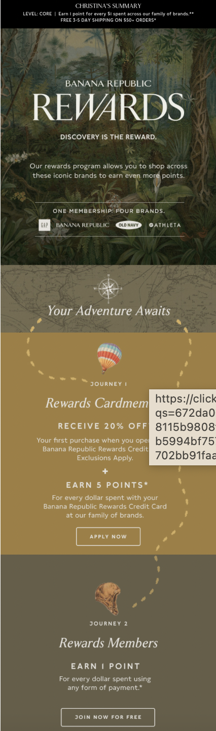 Signing up for the loyalty rewards program means to sign up for an adventure. Sprinkled throughout the homepage is fun, explorative language. Pictured left is my favorite section of the page.